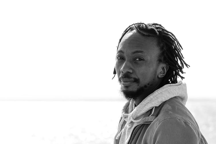 A man stand with his hands in his jacket pockets, in a grey hoodie with dreadlocks; he looks deadpan into camera.